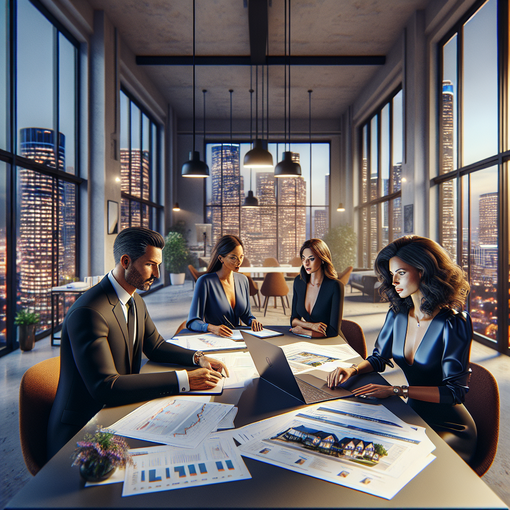 A lively Houston real estate scene with brokers engaging with clients against a city skyline.
